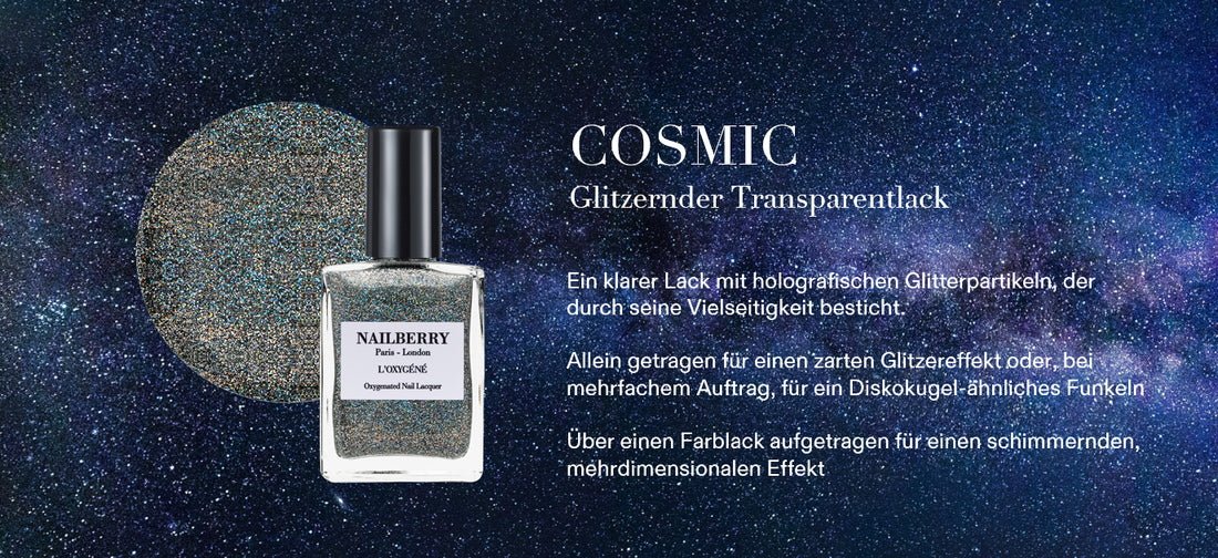Le top coat Cosmic aux paillettes holographiques donne à vos ongles un superbe éclat pailleté. La polyvalence est la clé : en une seule couche pour une brillance éblouissante, sur une couleur de vernis à ongles pour un top coat multidimensionnel et multifacettes, ou superposés les uns sur les autres pour un éclat disco radieux sous les projecteurs.