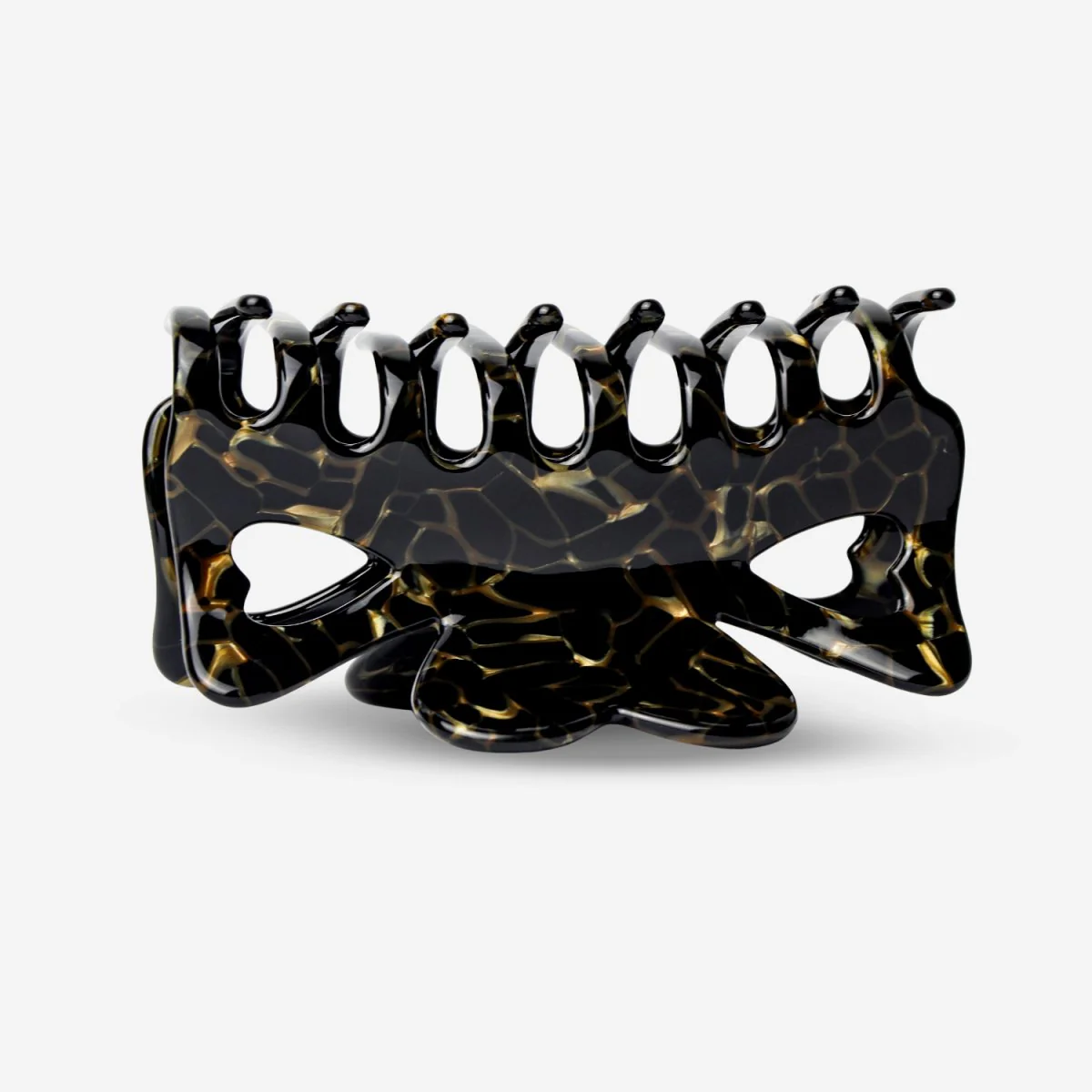 En présentation avec la barrette à cheveux Garbo Sasstie Tout votre amour pour vos produits. Des cœurs légèrement arrondis soulignent le design sophistiqué, tandis que les veines dorées scintillantes sur fond noir confèrent à cette barrette un look élégant.