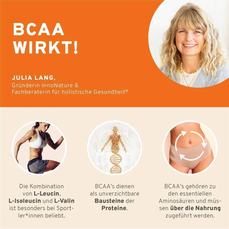 - La formule végétale de haute qualité d’Innonature est basée sur des BCAA, obtenus par la fermentation naturelle du maïs. Grâce au rapport de mélange bio-identique de 2:1:1, les BCAA soutiennent de manière optimale le développement musculaire et la régénération après l’entraînement.