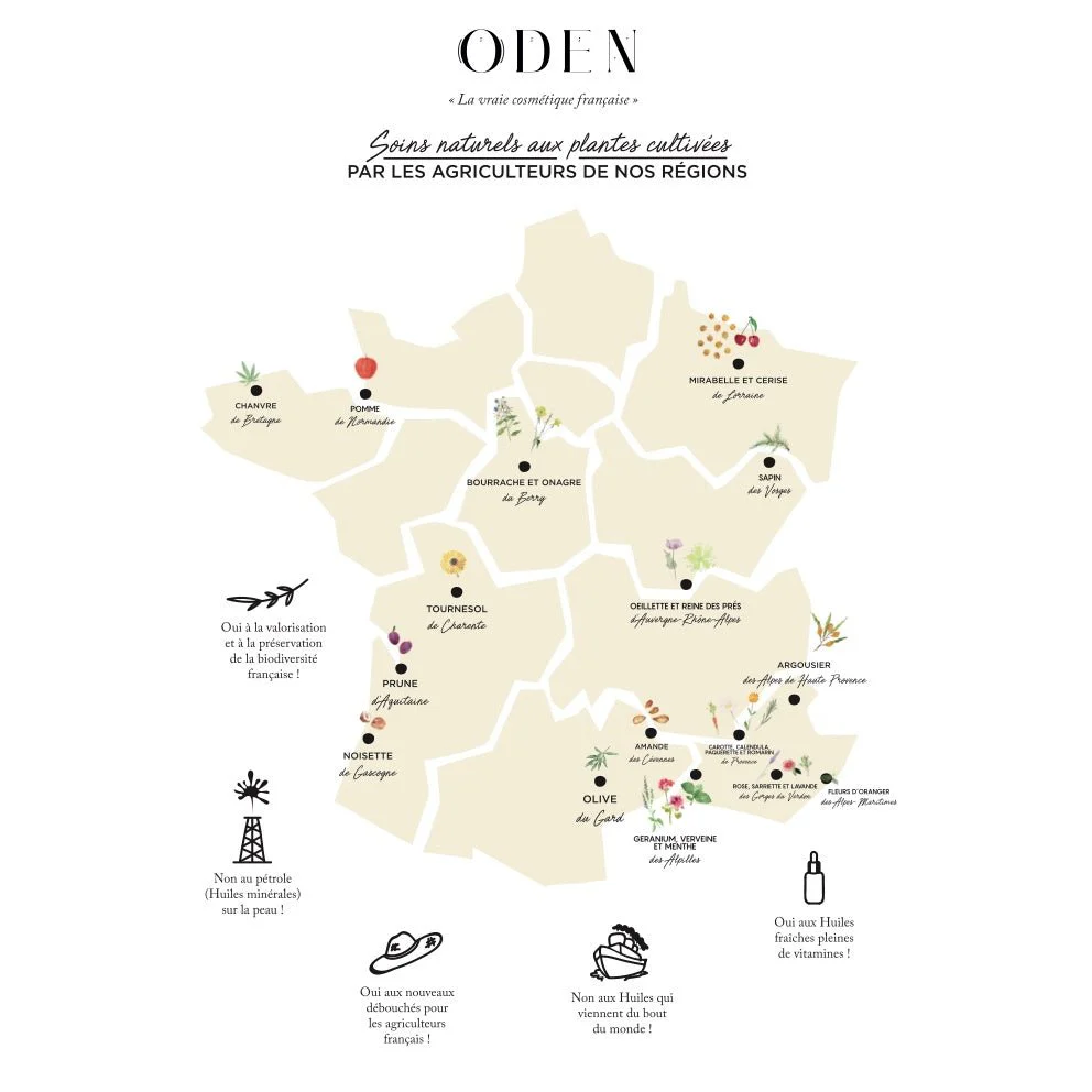 Oden: « Aujourd’hui, les amandiers sont rarement cultivés en France. Nous nous approvisionnons en amandes cultivées de manière durable auprès d’agriculteurs engagés Laurence et Jean. Leurs amandiers poussent sur des sols argilo-calcaires non irrigués de la région de Nîmes. Le rendement est plutôt faible, mais les arômes et principes actifs sont d’une qualité exceptionnelle. »