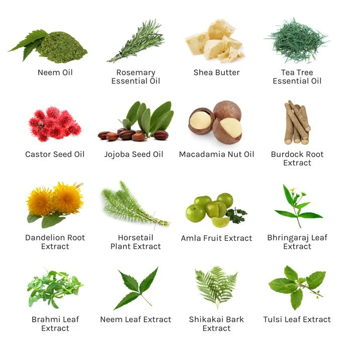 Huile de coco*, huile de ricin*, beurre de karité*, huile d’amande douce*, huile d’olive*, huile de pépins de raisin*, huile de noix de macadamia*, huile de noyau d’argan*, huile de graines de jojoba*, huile de neem, extrait de fruit d’Amla*, Extrait de noix de Shikakai*, extrait de feuille de Neem*, extrait de feuille de Bhringaraj*, extrait de feuille de Brahmi*, poudre de feuille de Tulsi*, extrait de racine de pissenlit, extrait de plante de prêle, extrait de racine de bardane*, huile d’arbre à thé*, huile de romarin*, huile de menthe poivrée*. , Huile de lavande*, Huile d’écorce d’orange*, Cera Alba.